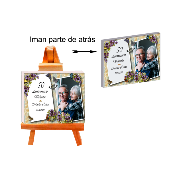 Lienzo con imán personalizada con foto nombre y fecha en caballete de madera. Con su diseño elegante de doble ventana para que podamos poner dos...