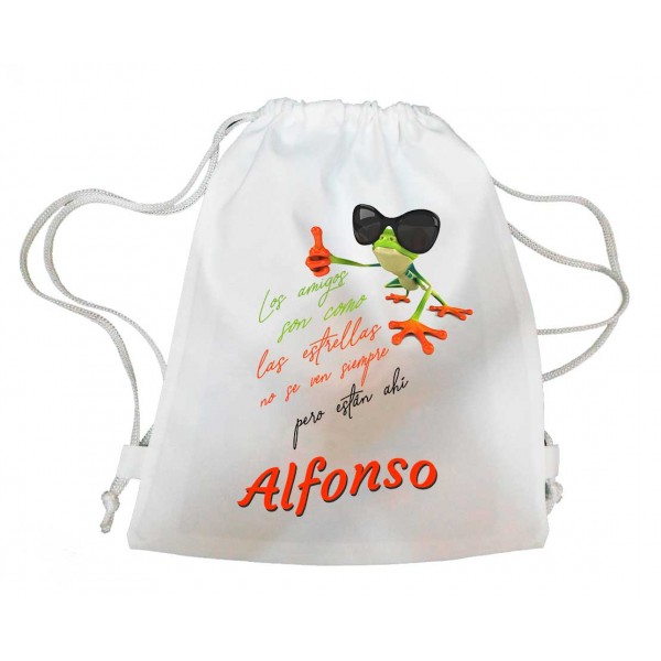 Mochila con rana simpática y frase motivadora, para que lo recuerden siempre!!. Personalizada con el nombre de cada uno de tus invitados. Muy...